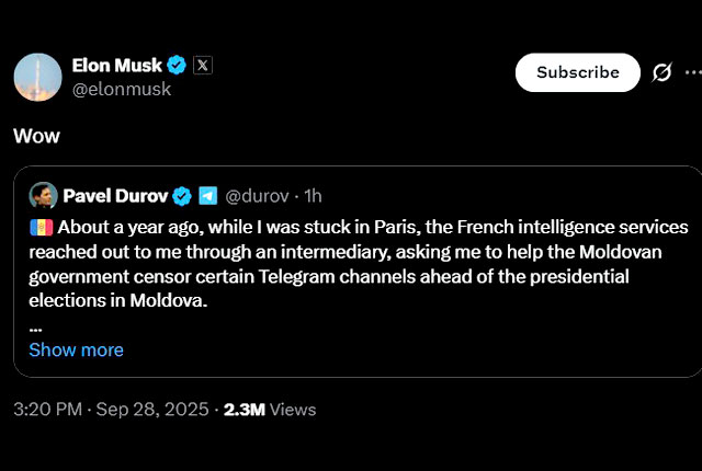 «Вау» — так отреагировал Маск на пост Дурова о запросах французских спецслужб цензурировать определённые Телеграм-каналы перед президентскими выборами в Молдове.