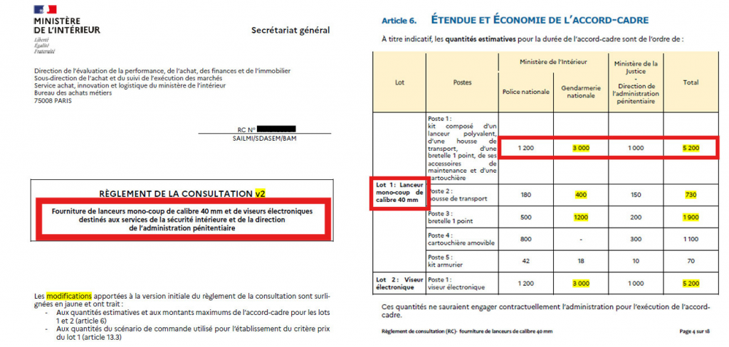 5,2 тыс. гранатомётов обойдутся французскому МВД в €21,8 млн. Ведомство намерено выбрать подрядчика в декабре 2025 года. Поставляемые гранатомёты должны стрелять как боевыми боеприпасами калибра 40 мм, так и нелетальными. Последние нужны «для стрельбы по дуге в рамках миссий по поддержанию и восстановлению правопорядка».