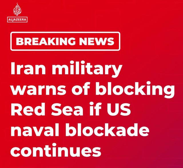 Военные Ирана предупреждают, что заблокируют всю торговлю в Красном море, Персидском заливе и Оманском заливе, если военно-морская блокада США продолжится, заявив, что любая угроза их кораблям будет «прелюдией» к нарушению перемирия. — Аль-Джазира.