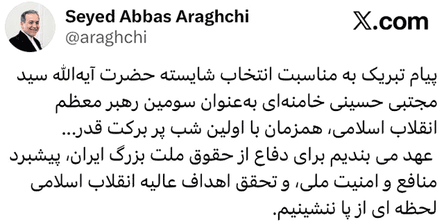 Он поздравил аятоллу Сейеда Моджтабу Хоссейни Хаменеи с избранием третьим верховным лидером и заявил, что дипломаты продолжат защищать интересы и безопасность иранской нации.