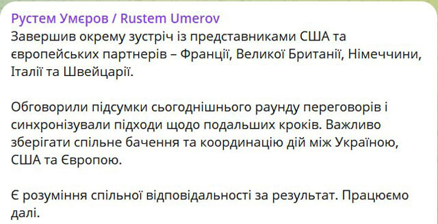 «Обсудили итоги сегодняшнего раунда переговоров и синхронизировали подходы к дальнейшим шагам. Важно сохранять общее видение и координацию действий между Украиной, США и Европой», – написал Умеров.