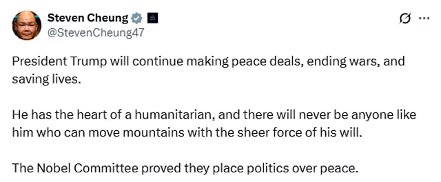 «Президент Трамп продолжит заключать мирные соглашения, заканчивать войны и спасать жизни. У него гуманитарное сердце, и никогда не будет никого, кто мог бы двигать горы одной лишь силой своей воли. Комитет Нобелевской премии доказал, что ставит политику выше мира», заявил Чунг.