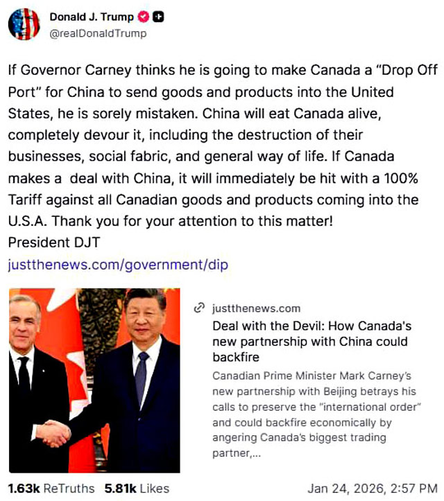 Дональд Трамп угрожает Канаде 100% пошлинами в случае если она заключит торговое соглашение с Китаем. Канадского премьера Марка Карни он назвал «губернатором».