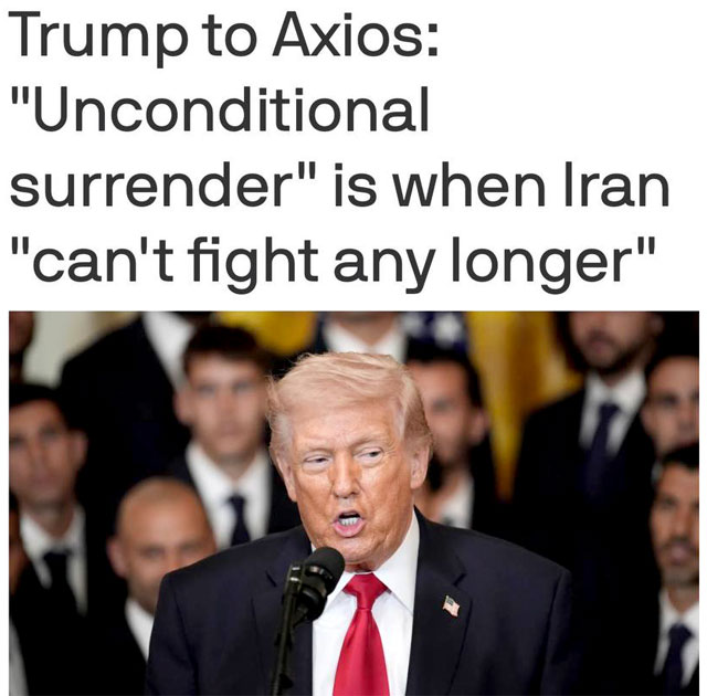 В интервью Axios президент США заявил, что под «безоговорочной капитуляцией» может подразумеваться не обязательно формальная сдача, а, например, «полное уничтожение военных возможностей режима».