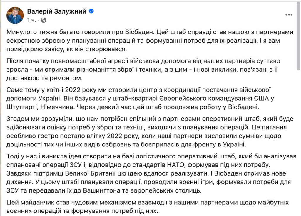 «В этом штабе планировали операции, проводили военные игры, формировали потребности для ВСУ и передавали их в Вашингтон и европейские столицы. Эта площадка стала отличным механизмом взаимодействия с нашими партнерами по поводу будущих военных операций и формирования потребностей под них», — пишет экс-главком.