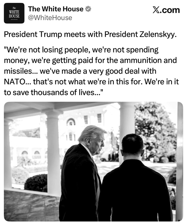 Белый дом после завершения встречи Трампа и Зеленского опубликовал откровенную фотографию с подписью: «Мы не теряем людей, мы не тратим деньги, нам платят за боеприпасы и ракеты… мы заключили очень выгодную сделку с НАТО… Это не то, ради чего мы в этом участвуем. Мы участвуем в этом, чтобы спасти тысячи жизней…