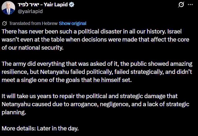 Лапид назвал сделку «политической катастрофой, никогда ранее не виданной в истории Израиля».