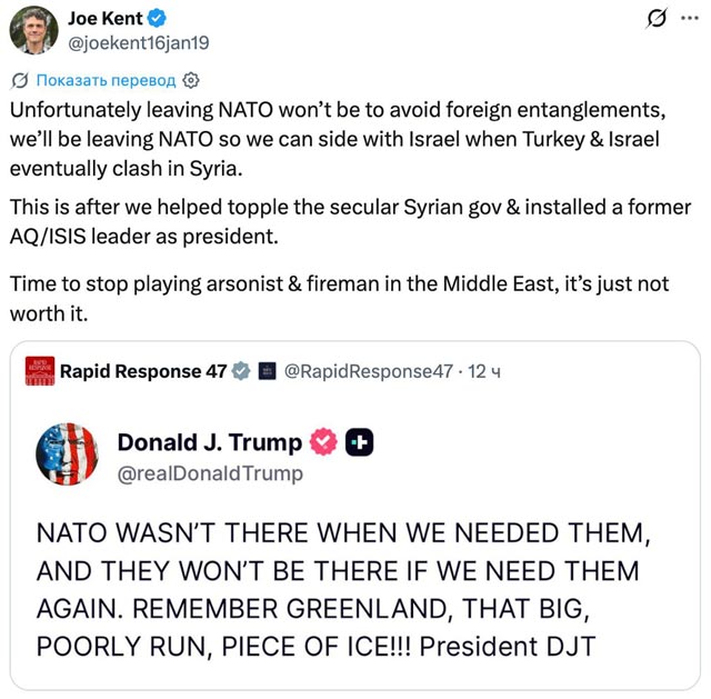 «Мы выйдем из НАТО, чтобы встать на сторону Израиля, когда Турция и Израиль в конечном итоге столкнутся в Сирии. И это после того, как мы помогли свергнуть светское сирийское правительство и поставили президентом бывшего лидера «Аль-Каиды» и ИГИЛ. Пора перестать играть в поджигателя и пожарного на Ближнем Востоке — это просто не стоит того», — написал Кент в Х.