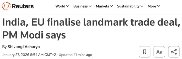 Reuters комментирует, что Индия и ЕС «стремятся застраховаться от нестабильных отношений с США».