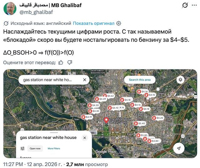 А спикер парламента Ирана Мохаммад Багер Галибаф написал в Х: «Наслаждайтесь текущими ценами на бензин. Скоро вы с ностальгией будете вспоминать дешевый бензин по 4-5 долларов».