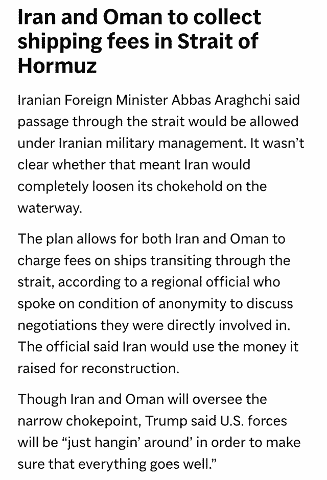 «План предусматривает взимание сборов с судов, следующих через пролив, как со стороны Ирана, так и со стороны Омана. Чиновник добавил, что Иран использует собранные средства на свое восстановление», — пишет агентство.