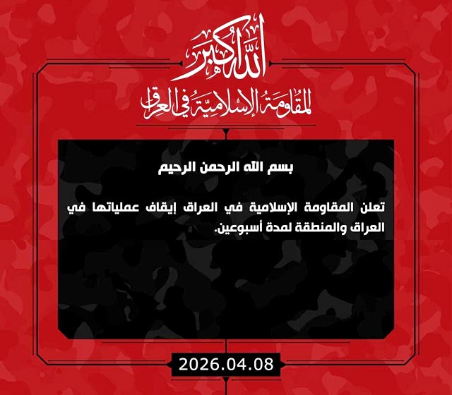 Исламское движение Сопротивления в Ираке объявляет о приостановке операций в Западной Азии сроком на две недели.