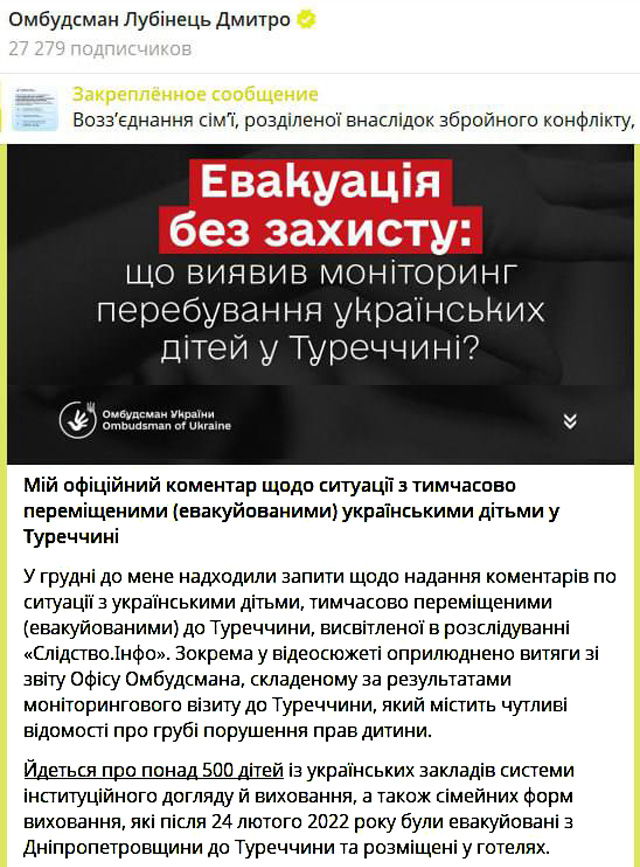 Омбудсмен Дмитрий Лубинец: Эвакуация без защиты — подтверждены системное насилие и грубые нарушения прав более 500 украинских детей-сирот, эвакуированных в Турцию.