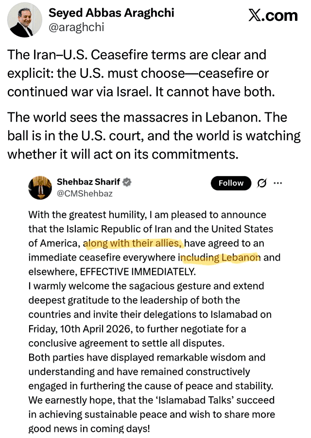 МИД Ирана Сеййид Аббас Аракчи опубликовал на своей официальной странице в сети X заявление Пакистана, где указано, что Ливан официально включён в перечень стран, где режим прекращения огня должен быть введён незамедлительно, подчеркнув: