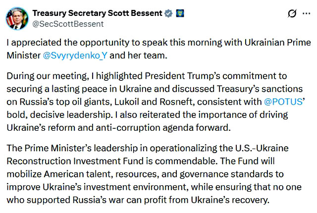 «Я был признателен за возможность поговорить сегодня утром с премьер-министром Украины Юлией Свириденко и её командой. Во время нашей общения я подчеркнул приверженность президента Трампа обеспечению прочного мира в Украине и обсудил санкции Минфина в отношении крупнейших российских нефтяных гигантов — «Лукойла» и «Роснефти», что соответствует смелому, решительному лидерству Дональда Трампа. Я также вновь подчеркнул важность продвижения вперёд реформ и антикоррупционной повестки Украины. Лидерство премьер-министра в реализации Инвестиционного фонда по восстановлению Украины — достойно похвалы. Фонд мобилизует американские таланты, ресурсы и стандарты управления для улучшения инвестиционного климата Украины, обеспечивая при этом, что никто, кто поддерживал войну России, не сможет извлечь прибыль из восстановления Украины», — заявил Бессент.