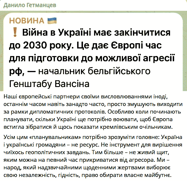 «Наши европейские партнёры своими заявлениями иногда, в последнее время даже слишком часто, просто вынуждают нас выходить за рамки дипломатических протоколов. Особенно когда они начинают планировать, сколько ещё Украине нужно воевать, чтобы Европа успела собраться и что-то показать кремлёвским лидерам. Все эти «планировщики» должны понять главное: Украина и украинские граждане – не ресурс. Не инструмент для решения чьих-то геополитических задач. Тем более – не живой щит, которым можно на время прикрываться от агрессора», – заявил Гетманцев.