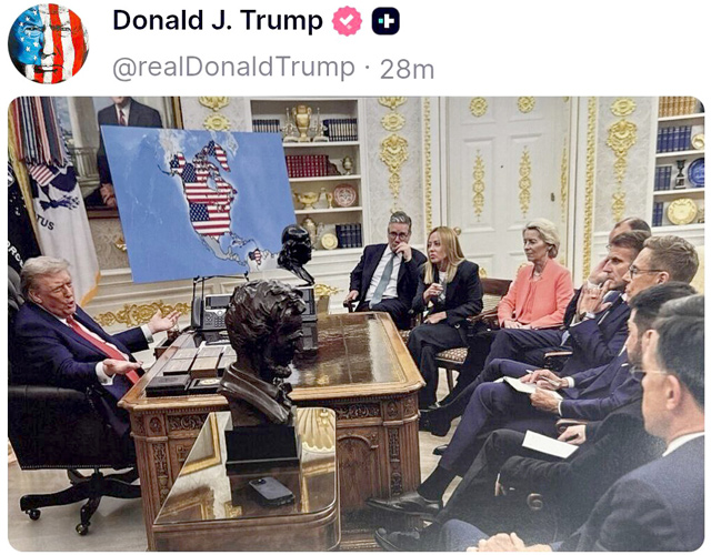 Он изобразил встречу с представителями Европы, которым президент США демонстрирует карту с Канадой и Гренландией, закрашенными в цвет американского флага.