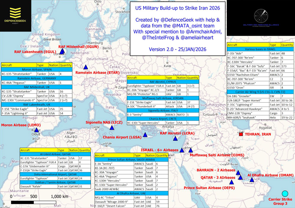 Кроме того, на авиабазах в Великобритании базируется дополнительно 35 ударных F-15E и 54 истребителя F-35A, которые в сопровождении 16 заправщиков KC-135 могут быть также оперативно переброшены на Ближний Восток для поддержки воздушного наступления против Ирана.