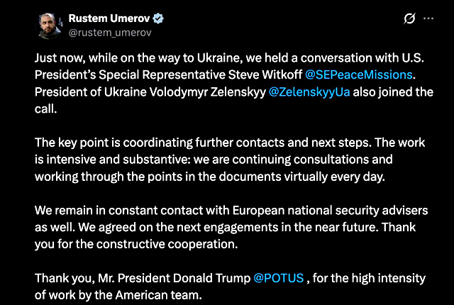 «Только что, по пути в Украину, мы провели беседу со специальным представителем президента США Стивом Виткоффом. К разговору также присоединился президент Украины Владимир Зеленский.