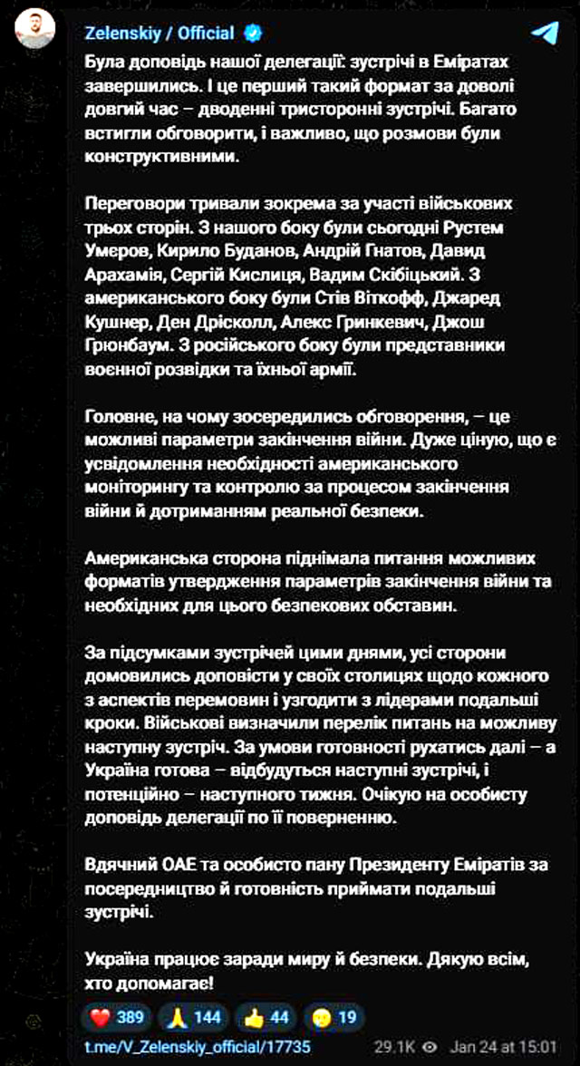 Напомним, основным вопросом переговоров в ОАЭ, как заявлялось ранее, являлось обсуждение вывода украинских войск из Донецкой области, на чем настаивает РФ и, как пишут СМИ, Трамп.