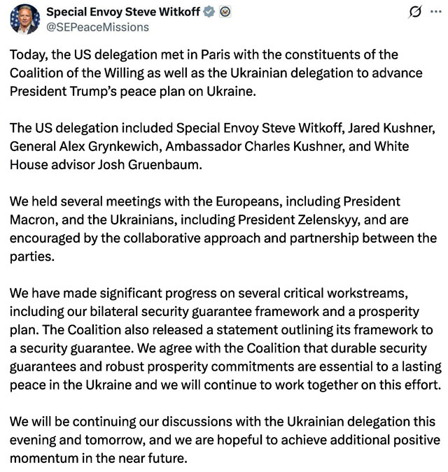 Заявление спецпредставителя Белого дома Стива Уиткоффа показательно прежде всего тем, чего в нём нет. США сознательно не подтвердили идею размещения международных или американских сил в Украине, не зафиксировали формат «гарантий» и ограничились языком процесса — «framework», «workstreams», «continue discussions». Это означает, что Вашингтон пока не готов брать на себя прямые силовые обязательства, которые автоматически делали бы его стороной возможного будущего конфликта.