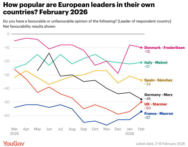 У всех нынешних европейских лидеров сейчас антирейтинг больше рейтинга (результаты февральского опроса Серии соцопросов YouGov European tracker).