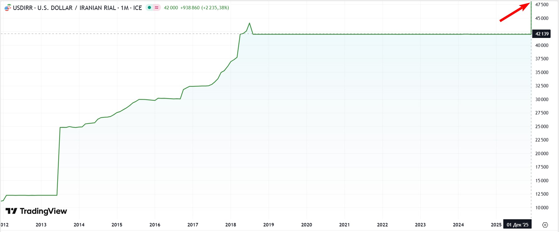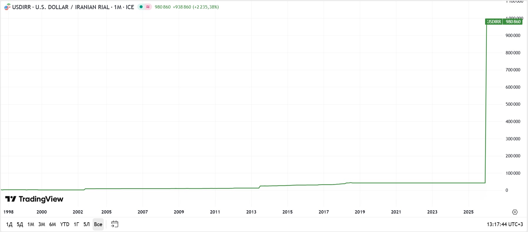 В тизере курс доллара к иранскому риалу, но шкала времени там сдвинута произвольно, чтобы отчетливее показать, что же у них случилось. Как видно, до декабря 2025 доллар и так дорожал, но… не так резко, как это случилось следом, с 1 (поправка) с 6-го января 2026. Скрин ниже уже за все время и автоматически масштабируется, учитывайте также, что это курс официальный, а есть еще и теневой рынок.