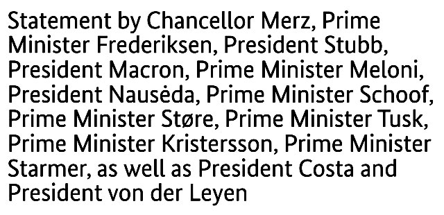 Заявление опубликовано на правительственных сайтах и подписано канцлером ФРГ Фридрихом Мерцем, президентом Финляндии Александером Стуббой, Франции Эммануэлем Макроном, премьер-министром Великобритании Киром Стармером, Дании Мэтте Фредериксен, Италии Джорджей Мелони, Норвегии Схоофом, Швеции Ульфом Кристерссоном и президентом Еврокомиссии Урсулой фон дер Ляйен и Евросовета Антонио Коштой.
