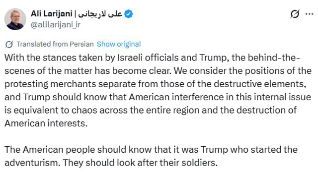 «С учётом позиций, занятых израильскими официальными лицами и Трампом, закулисная сторона вопроса стала ясна. Мы рассматриваем позиции протестующих торговцев отдельно от позиций разрушительных элементов, и Трамп должен знать, что американское вмешательство в этот внутренний вопрос равносильно хаосу во всём регионе и разрушению американских интересов. Американский народ должен знать, что именно Трамп начал авантюризм. Им следует позаботиться о своих солдатах», — заявил секретарь Совета национальной безопасности Ирана Лариджани.