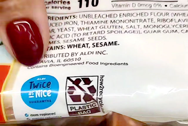 Американка в продуктовом магазине показывает, что на каждом предмете, который она берёт, написано: «Содержит биоинженерные ингредиенты». «Я здесь, в Aldi, и почти всё, что у них есть, содержит биоинженерные пищевые ингредиенты». Всё это поддельная еда, к американцам относятся как к подопытным крысам.