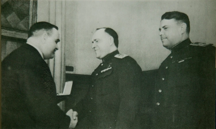 Председатель президиума Верховного Совета СССР Шверник вручает самый редкий и высокий орден «Победа» маршалам Жукову и Василевскому. Через несколько лет Жуков предложит Василевскому уйти в отставку.
