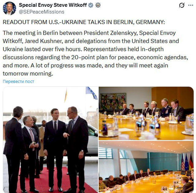 «Встреча в Берлине между президентом Зеленским, специальным посланником Уиткоффом, Джаредом Кушнером и делегациями из США и Украины длилась более пяти часов. Представители провели углубленные дискуссии по плану мирного урегулирования, экономическим программам и другим вопросам. Был достигнут значительный прогресс, и завтра утром состоится повторная встреча», — написал спецпосланник президента США.