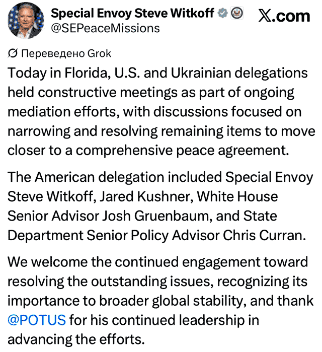 «Сегодня во Флориде делегации США и Украины провели конструктивные встречи в рамках продолжающихся усилий по посредничеству, в ходе которых обсуждались вопросы сужения и разрешения оставшихся пунктов для приближения к всеобъемлющему мирному соглашению.