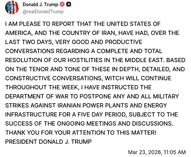 Он добавил, что распорядился на пять дней отложить удары по энергетической инфраструктуре Ирана, увязав это с исходом продолжающихся переговоров.