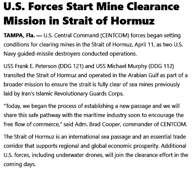 «Сегодня мы начали процесс создания нового прохода и вскоре поделимся этим безопасным маршрутом с морской отраслью, чтобы способствовать свободному движению торговли», — заявил командующий CENTCOM адмирал Брэд Купер.