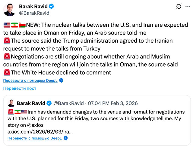 США согласились с просьбой Ирана перенести переговоры из Турции в Оман, сообщает журналист Axios Барак Равид со ссылкой на арабский источник.