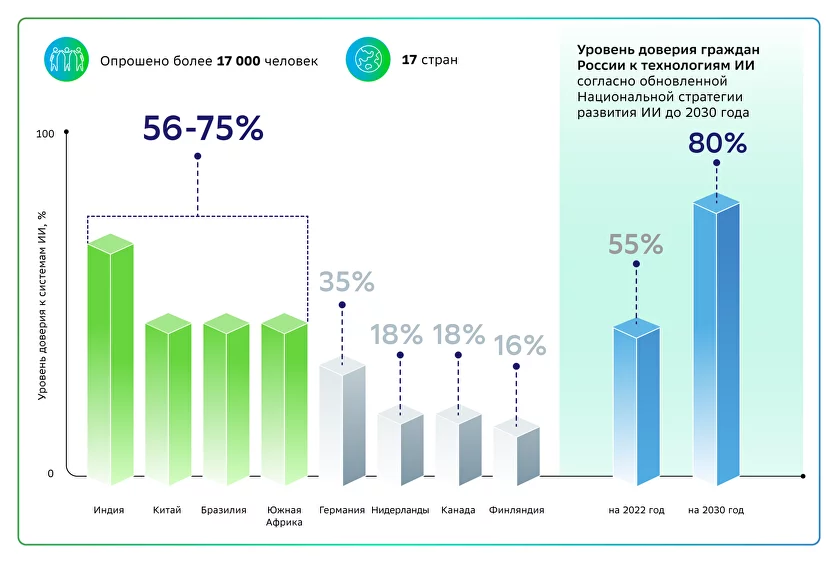 Более высокое доверие и признание ИИ в странах БРИКС, вероятно, связано с ускоренным внедрением ИИ в этих странах и все более важной экономической ролью новых технологий. Люди в странах БРИКС наиболее позитивно относятся к ИИ, видят в нем выгоду и сообщают о самых высоких уровнях внедрения и использования его в работе.
