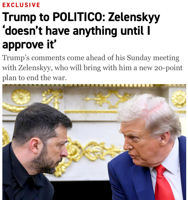 «Зеленский ничего не имеет, пока я это не одобрю», — заявил Трамп в интервью Politico накануне встречи с Зеленским.
