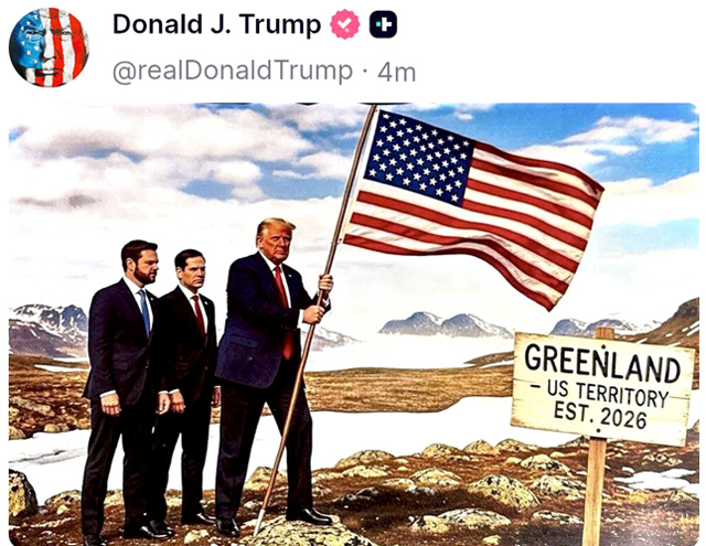 Трамп опубликовал картинку, на которой он, вице-президент Вэнс и госсекретарь Рубио устанавливают американский флаг в Гренландии