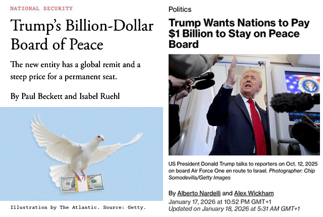 «Американский чиновник подтвердил агентству Bloomberg News, что, хотя вступление в организацию будет бесплатным, взнос в размере 1 миллиарда долларов обеспечит постоянное членство. Собранные средства будут использованы непосредственно для выполнения мандата Совета мира по восстановлению Газы, заявил чиновник, говоривший на условиях анонимности. Совет обеспечит использование почти каждого собранного доллара для выполнения своего мандата, добавил чиновник», — пишет Bloomberg.