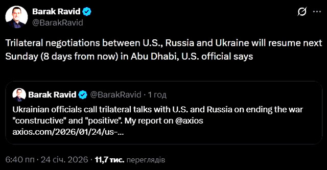 Трехсторонние переговоры между США, Россией и Украиной возобновятся в следующее воскресенье, 1 февраля, в Абу-Даби.