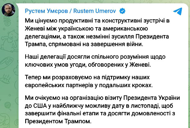 Секретарь СНБО Рустем Умеров отметил, что Украина ценит продуктивные встречи в Женеве, а также усилия Дональда Трампа, направленные на завершение войны.