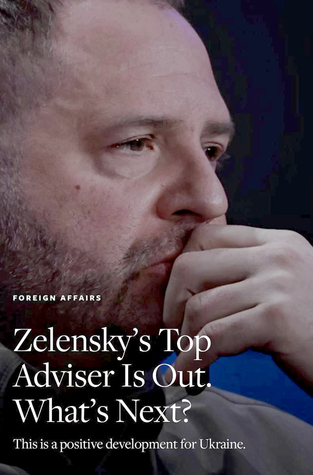 «Ермак давно придерживается жёсткой позиции на переговорах и выступал против уступок, которые, по мнению аналитиков, необходимы для достижения мирного соглашения. На этой неделе он заявил, что Зеленский никогда не обменяет земли на мир, хотя предложение США допускало уступки части украинской территории и превращение её в демилитаризованную зону (имеется в виду вывод украинских войск со всей территории Донецкой области — Ред.). В прошлом году Ермак был соавтором статьи в журнале Foreign Affairs, в которой «победа» была представлена ​​как единственный путь к миру для Украины. Хотя это несбыточная мечта, учитывая военное превосходство России.