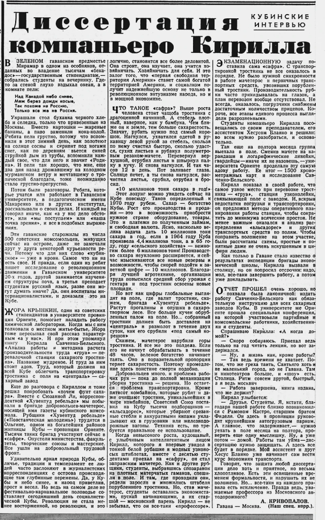 «Диссертация компаньеро Кирилла» — статья с таким названием вышла в «КП» 20 апреля 1966 года. В ней журналист Кривопалов рассказывал, как провел свой день на плантации сахарного тростника на Кубе и как облегчила транспортировку тростника с поля на сахарный завод русская книга. Ее написал московский аспирант Автодорожного института Кирилл Савченко-Бельский, которого впереди ждала защита диссертации.