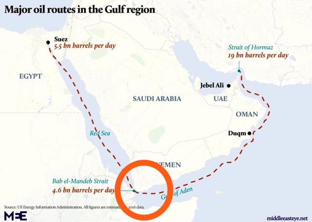 Этот пролив соединяет Красное море с Аденским заливом и фактически открывает путь из Индийского океана к Суэцкому каналу. Через него идет поток нефти и нефтепродуктов из Персидского залива в Европу и часть стран Средиземноморья.