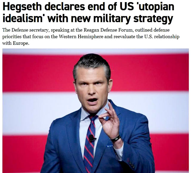 В своей речи на оборонном форуме имени Рейгана министр обороны США Пит Хегсет жестко раскритиковал политику предыдущих американских администраций, пишет Politico, анализируя его речь. «Эпоха американского утопического идеализма закончилась, — сказал Хегсет. — Долой идеалистический утопизм. Да здравствует жесткий реализм».